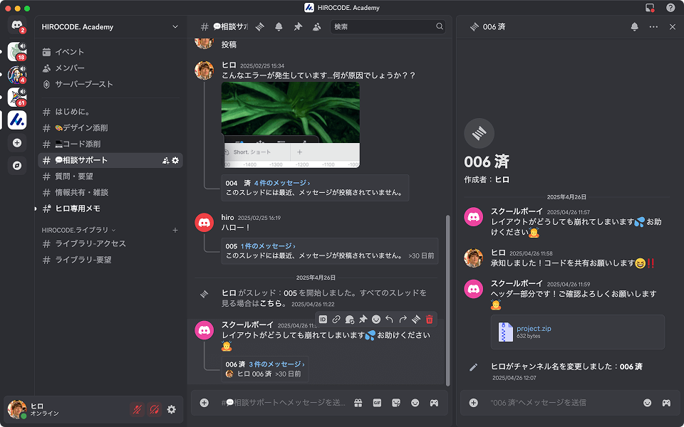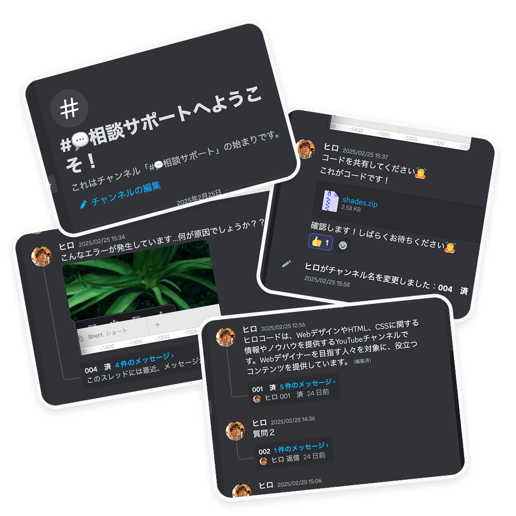 ヒロコード本人による直接添削・フィードバックを全ての受講生に提供。チャンネル登録者7万人の実績あるデザイナーから学べるため、メンターの当たり外れがなく、確かな品質のサポートを受けられます。