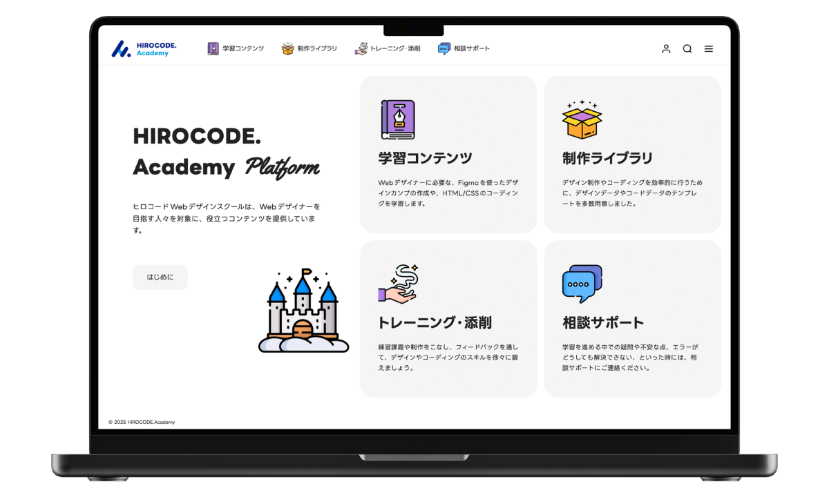 デザインの基礎からデザインカンプ制作、コーディングまで、Webデザイナーに必要な学習コンテンツを無期限で利用可能。