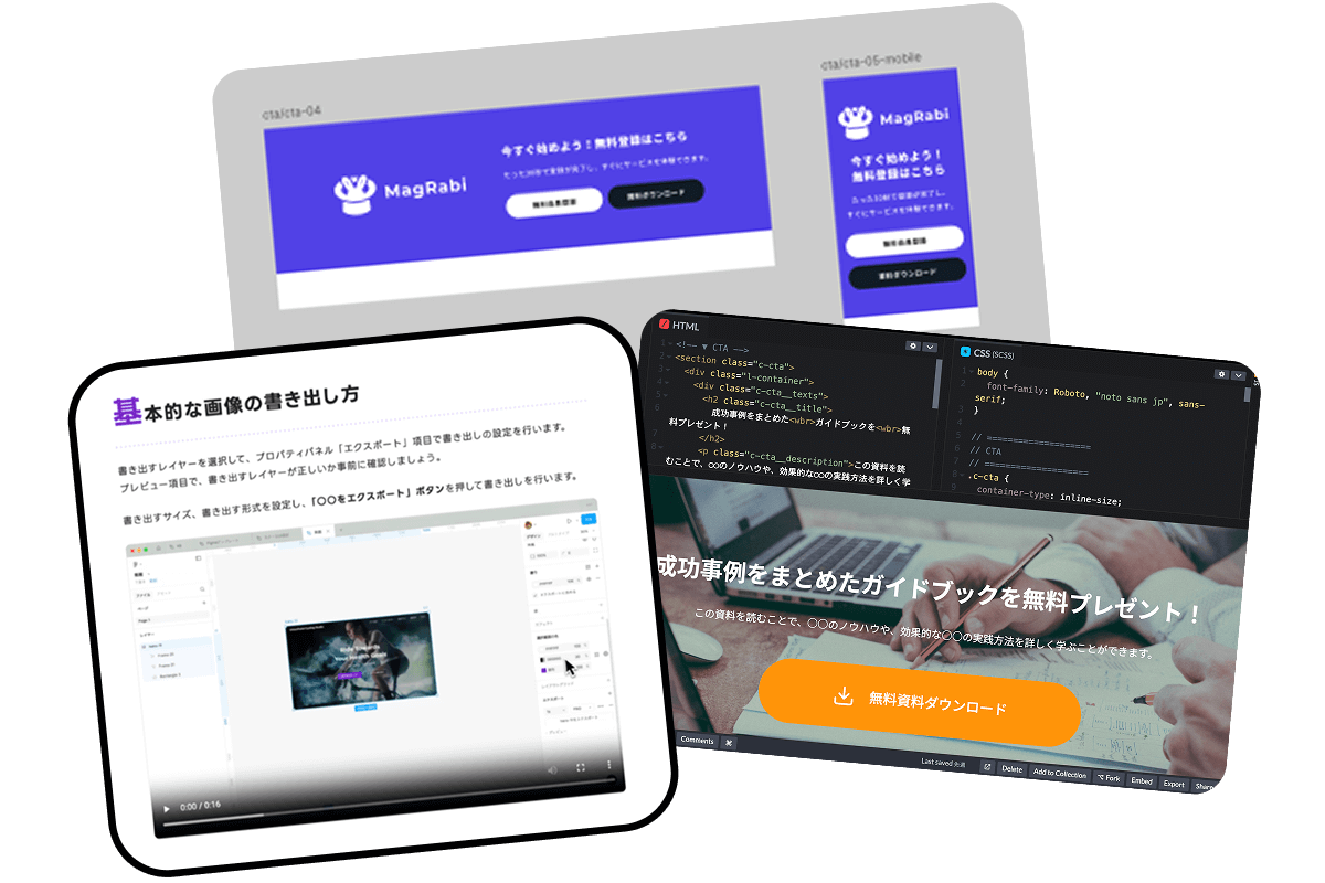 効率的に制作する制作ライブラリは、Web制作の基盤作成をサポートします。 テンプレートをベースに、細かなスタイルや装飾を加えていけば、時間を短縮して、質の高い制作物を作成できます。
